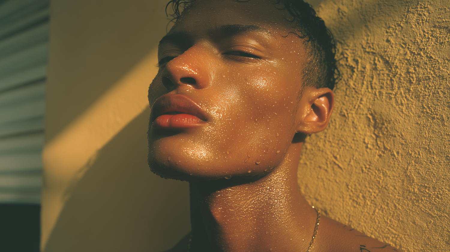 Close-up of a person with glowing skin and water droplets, bathed in warm sunlight against a textured yellow wall.