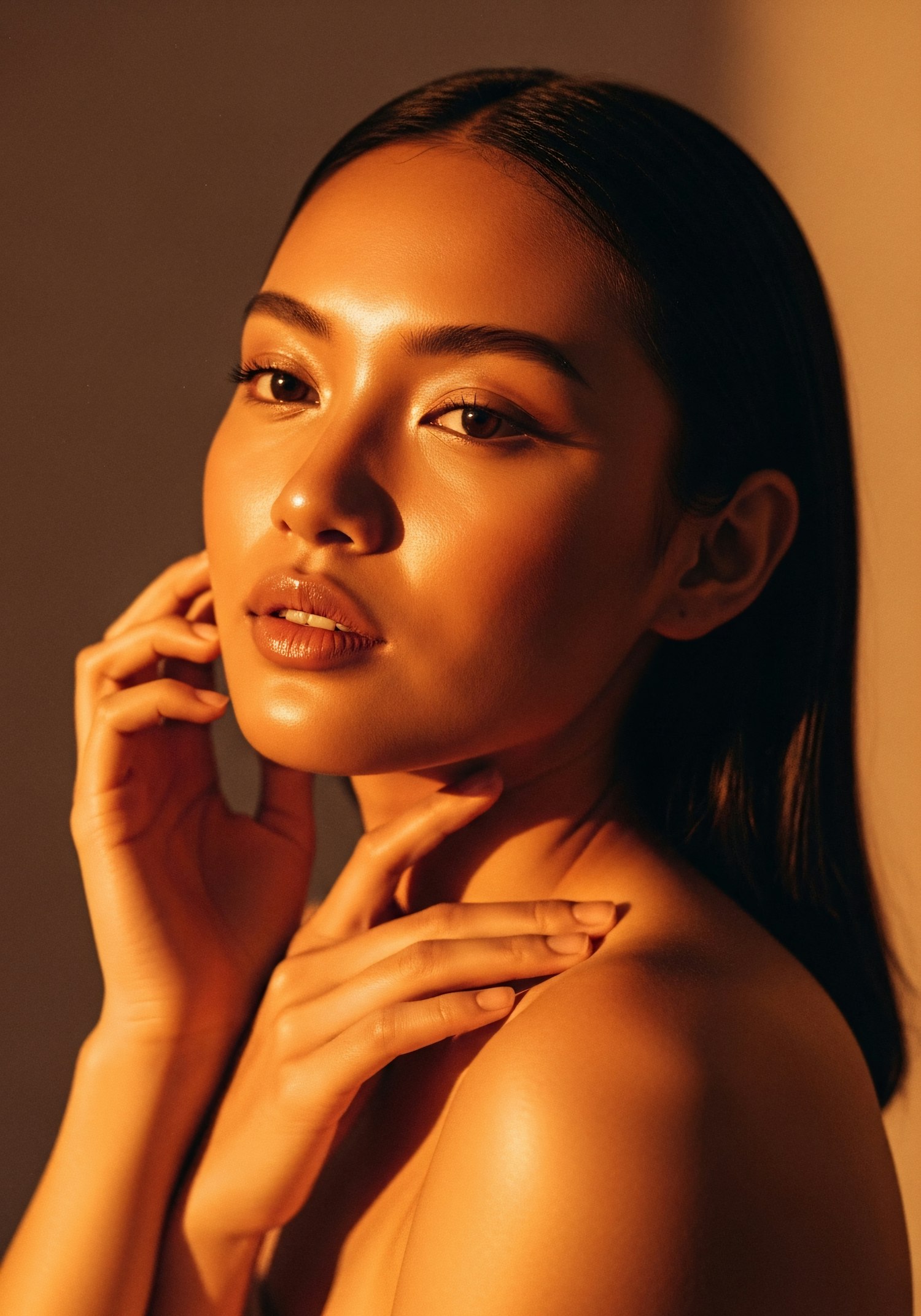 A close-up portrait of a woman with glowing skin, warm lighting, and a serene expression, emphasizing natural beauty and elegance.