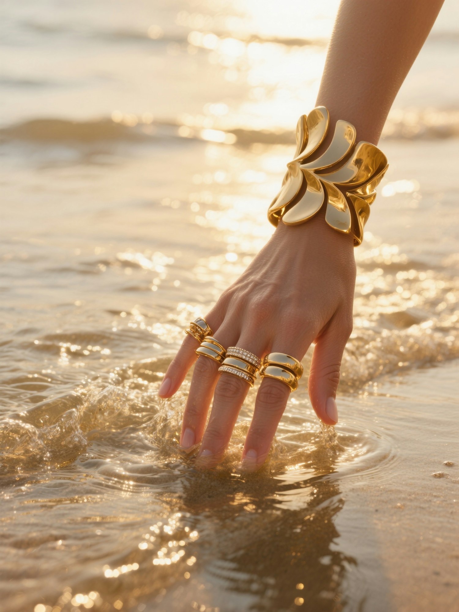 Editorial close-up detail shot at golden hour, elegant hand touching the shoreline as gentle waves shimmer in the sunlight. The focus is on bold sculptural golden jewelry: a large statement bracelet and stacked rings, catching warm reflections. Skin illuminated with natural golden highlights, water sparkling softly around the hand. The atmosphere is refined, minimal, and luxurious, emphasizing the jewelry as art pieces. Style: high-end fashion editorial photography, warm golden tones, soft cinematic contrast, realistic skin and water textures, cohesive sophisticated summer campaign look