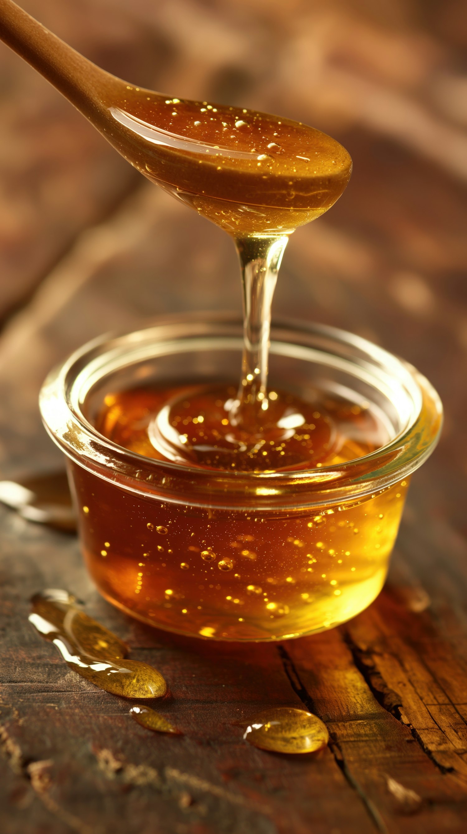 Golden honey drizzles from a wooden spoon into a glass jar on a rustic wooden surface, capturing its rich, amber hue and texture.
