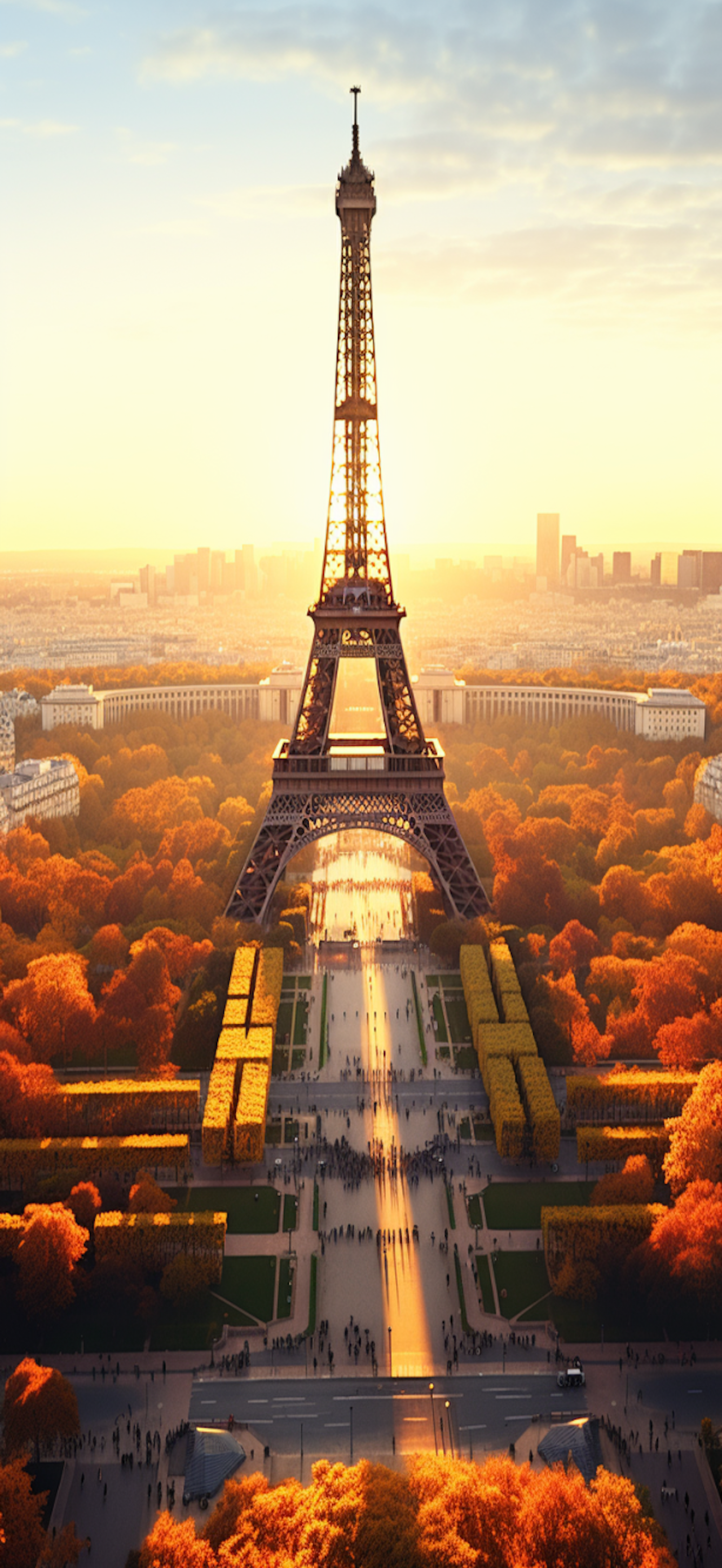 Eiffel Tower at sunset with vibrant autumn colors and a bustling pathway, capturing the essence of a serene Parisian evening.