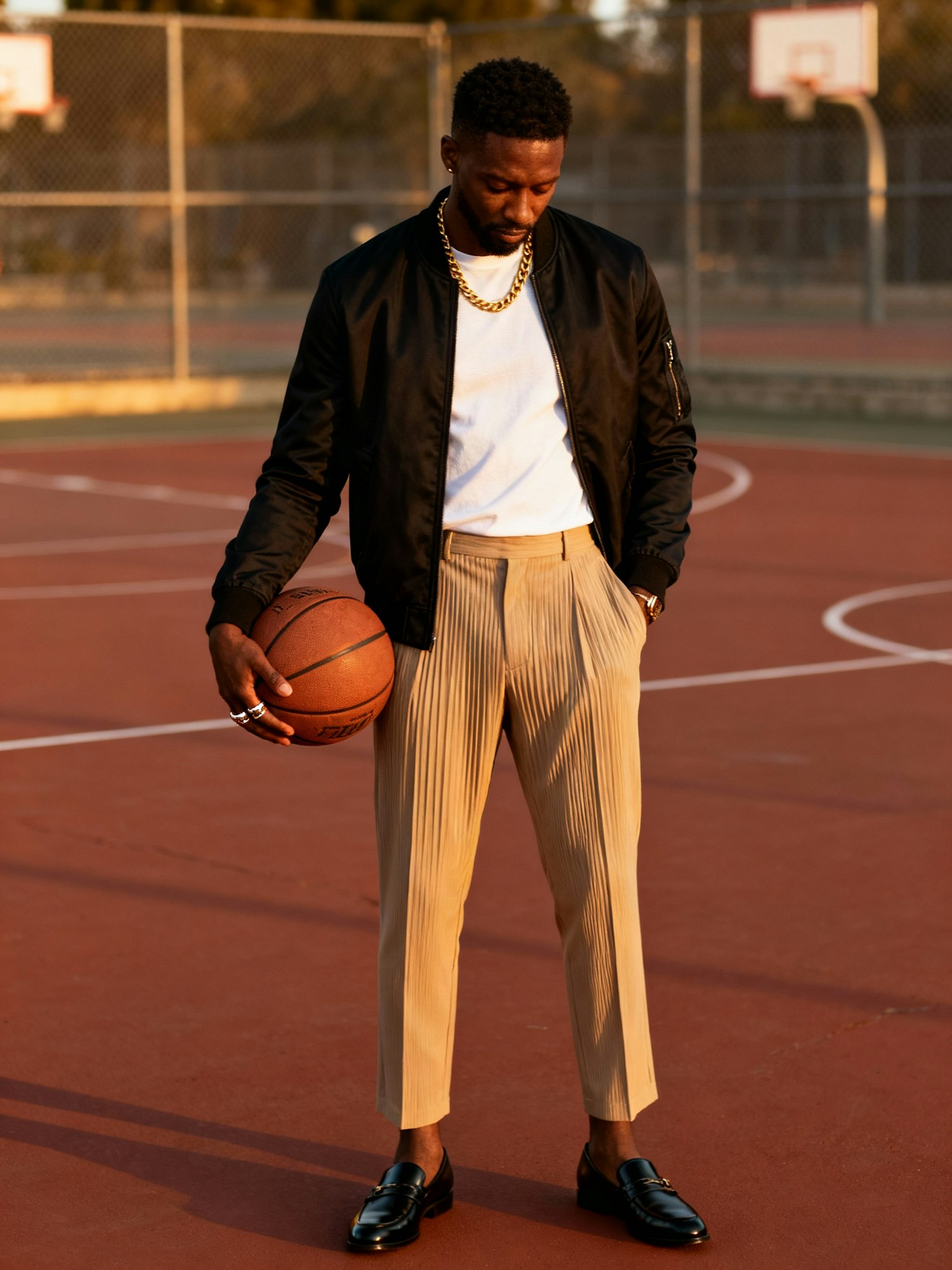 A close-up editorial portrait of a stylish Black man standing alone on an outdoor basketball court at golden hour. He wears a street-classy outfit: a tailored black bomber jacket layered over a crisp white tee, paired with pleated beige trousers and polished black loafers. A gold chain and subtle rings add understated elegance. He holds a basketball at his side, gazing downward with one hand in his pocket, evoking quiet reflection and grounded strength. His glowing, hyperrealistic skin harmonizes with the warm tones of the court and the soft, directional lighting. The background features muted fencing and distant hoops, softened to a clay red — chosen to complement his skin tone and elevate the editorial mood.