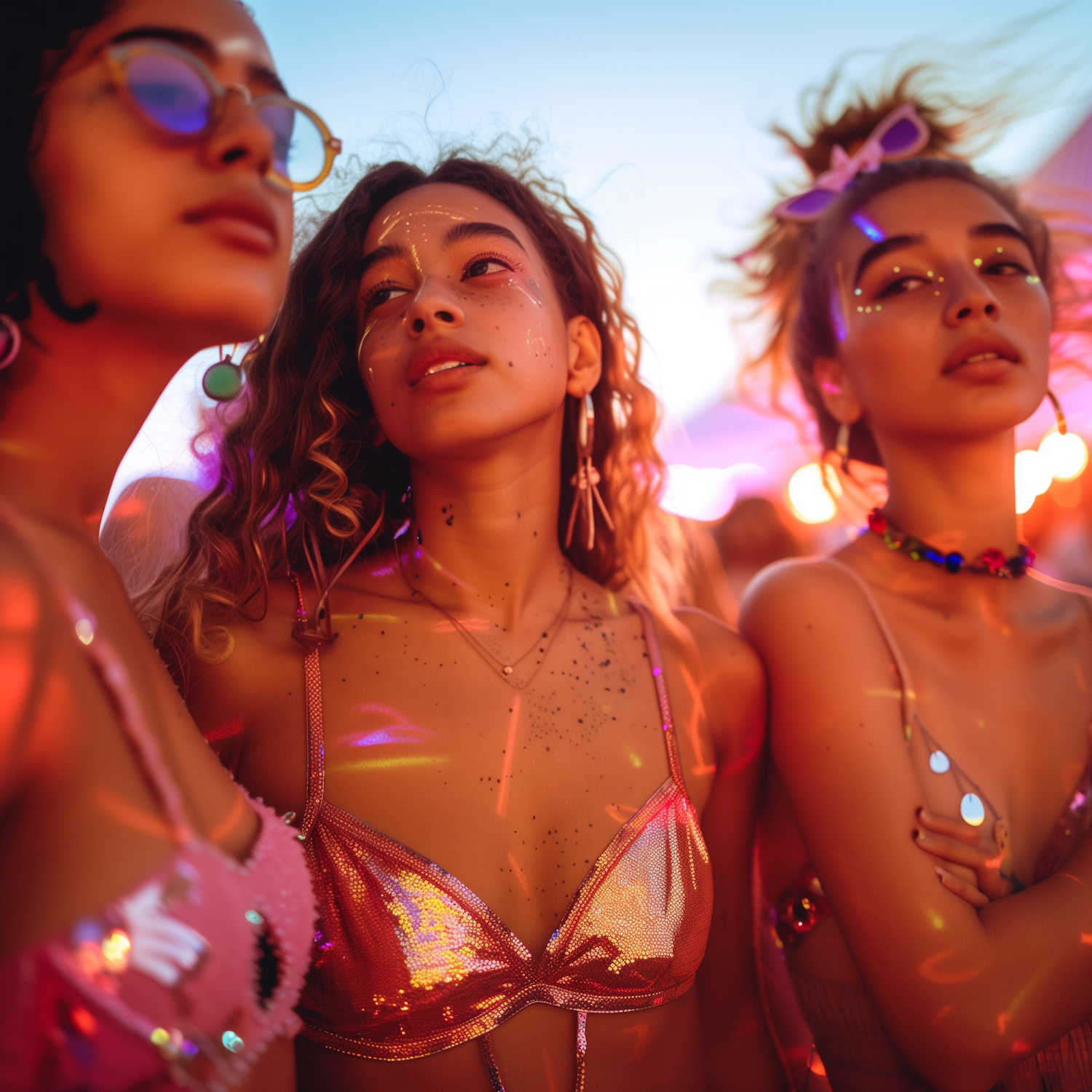 Three women in festival attire with glitter and face paint, enjoying vibrant lights and a lively atmosphere.