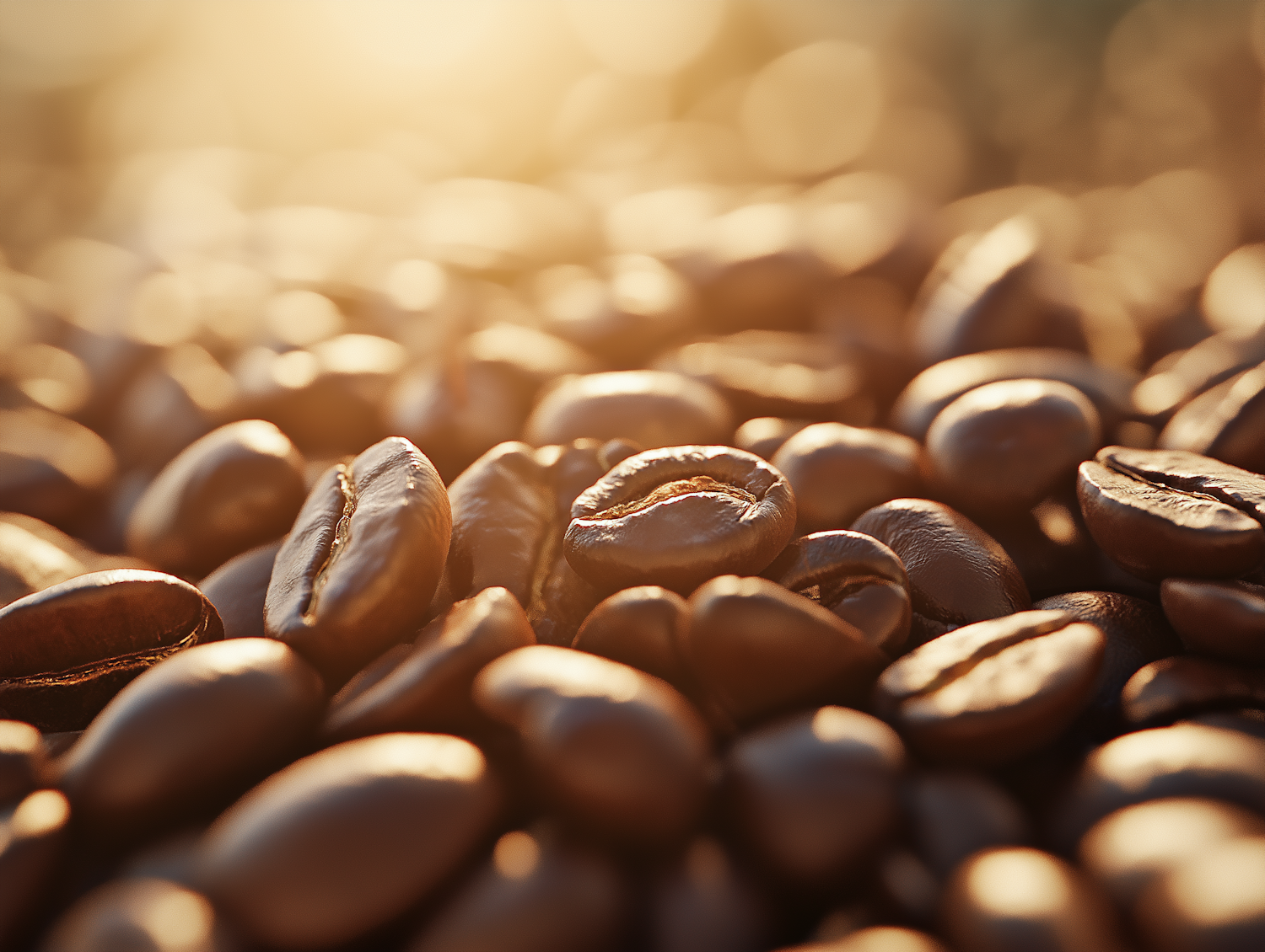 Close-up of glossy roasted coffee beans in warm sunlight, highlighting their rich brown color and smooth texture.