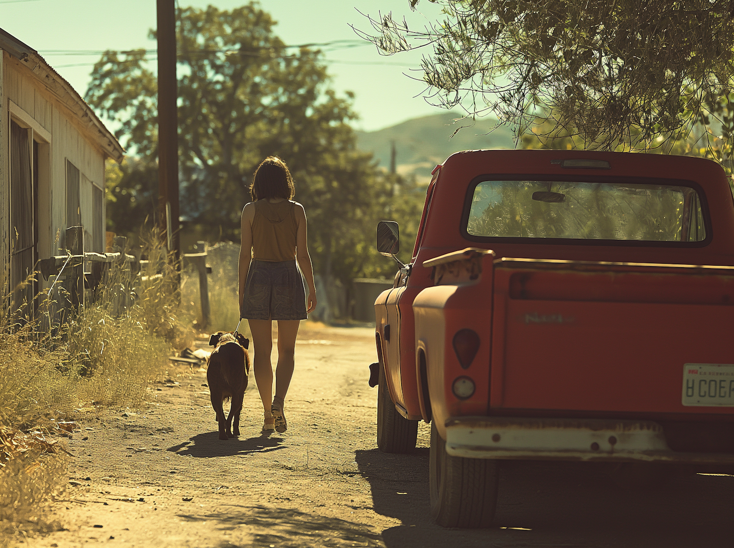 Woman walking a dog down a sunlit path beside a vintage red truck, creating a nostalgic rural scene.