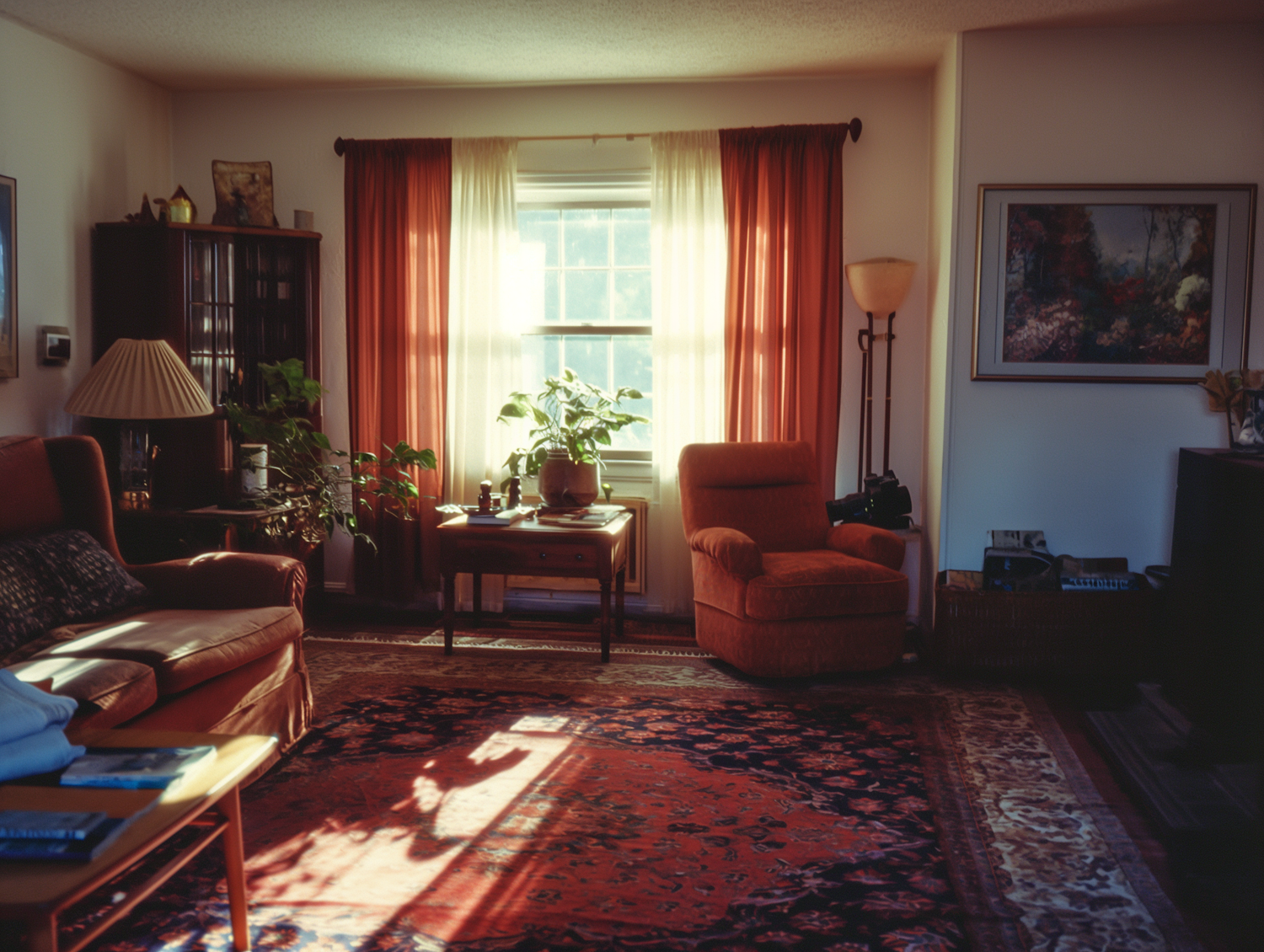 Cozy living room with warm sunlight, rust-colored furniture, oriental rug, and potted plants, creating an inviting atmosphere.