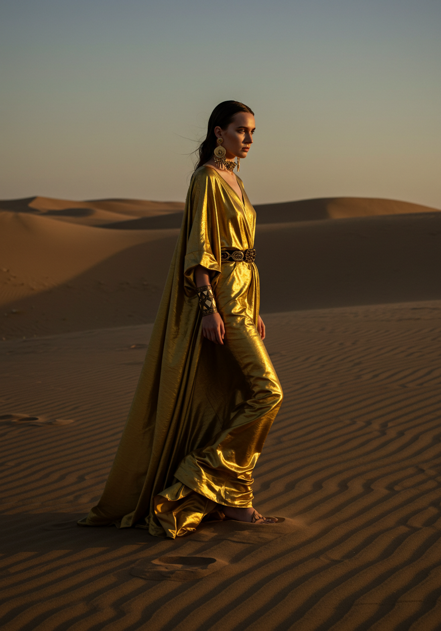 A woman in a shimmering gold gown poses in a serene desert at sunset, accessorized with bold jewelry and surrounded by rippled sand dunes.
