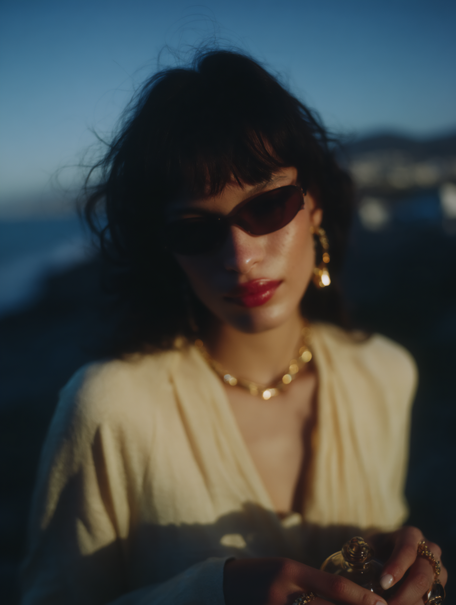 A stylish woman in golden hour light, wearing sunglasses, gold jewelry, and holding a perfume bottle against a coastal backdrop.
