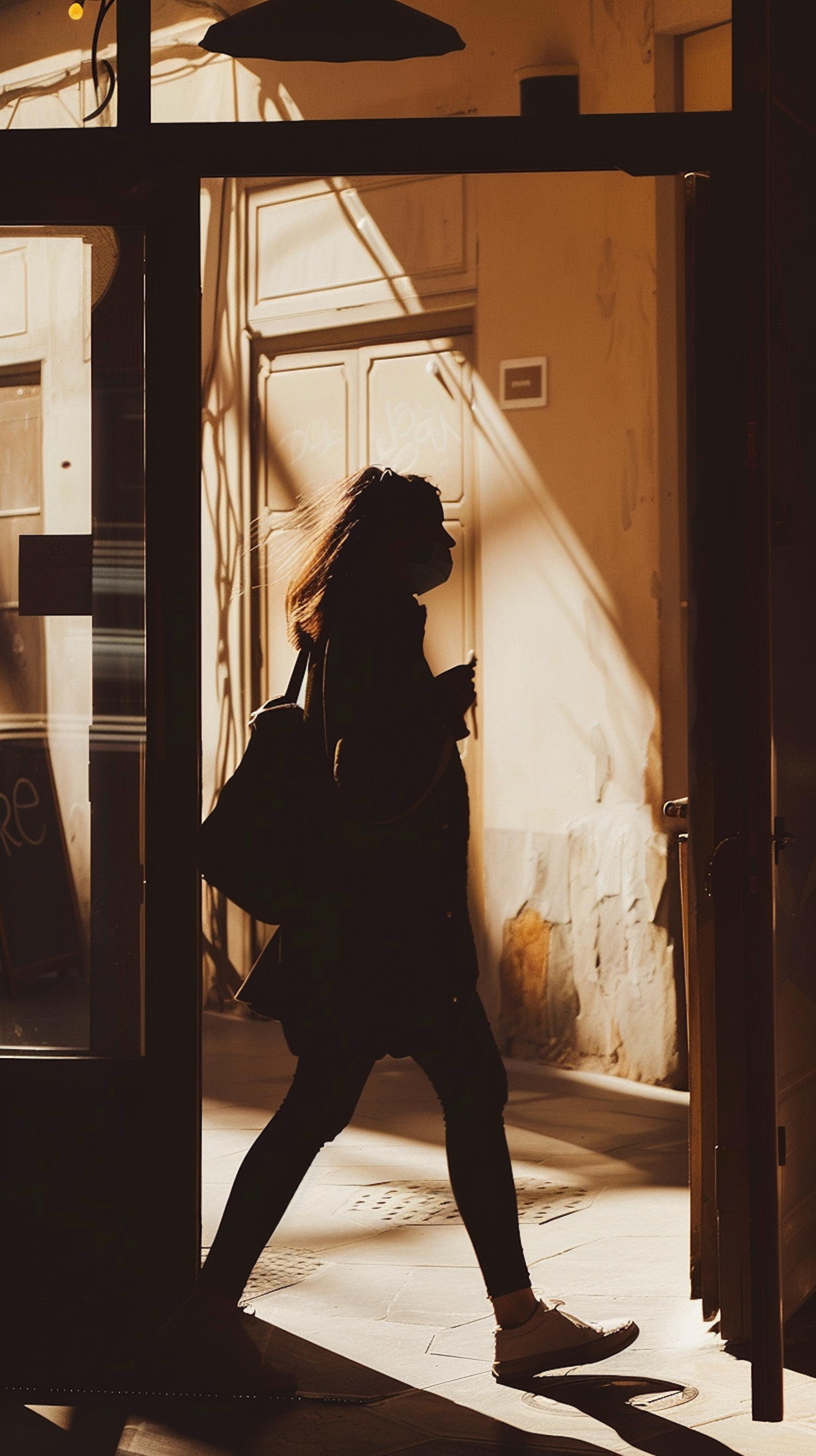 Silhouette of a person walking through a sunlit doorway, casting dramatic shadows. Warm tones create a mysterious, intriguing atmosphere.