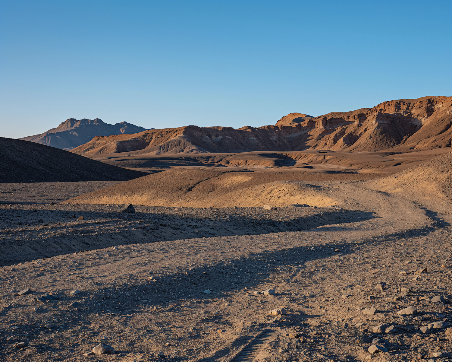 Vast desert landscape with rocky hills under a clear blue sky, featuring a winding path and warm earthy tones.