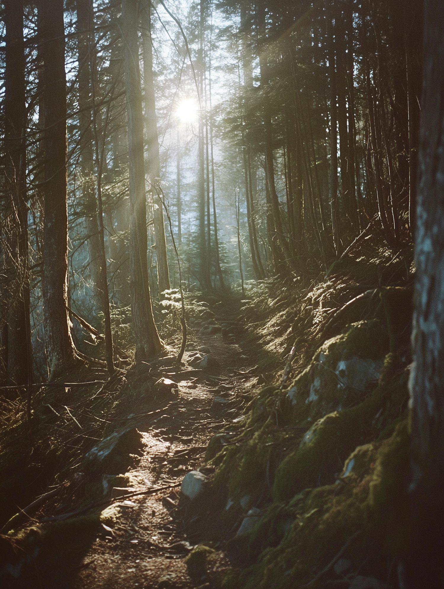 Sunlit forest path with tall trees and mossy ground, creating a serene and tranquil atmosphere.