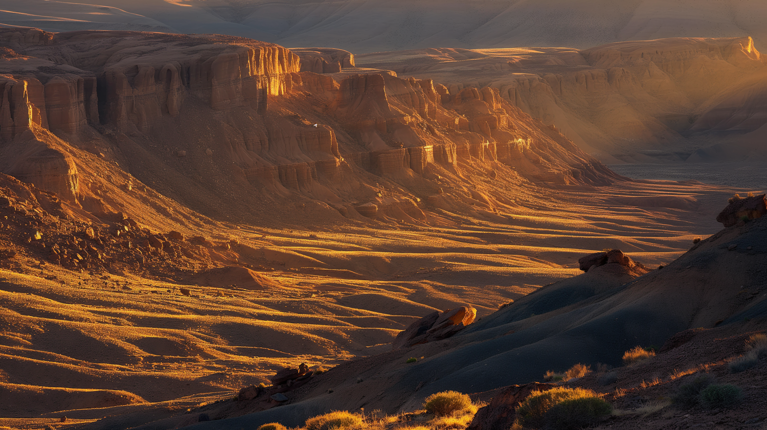 Stunning desert landscape with sunlit cliffs and shadows, showcasing rich earthy tones and dramatic natural beauty.