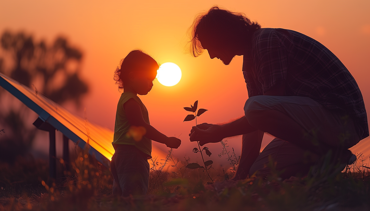 Silhouette of a man and child planting at sunset, with solar panels in the background, symbolizing sustainability and nurturing.