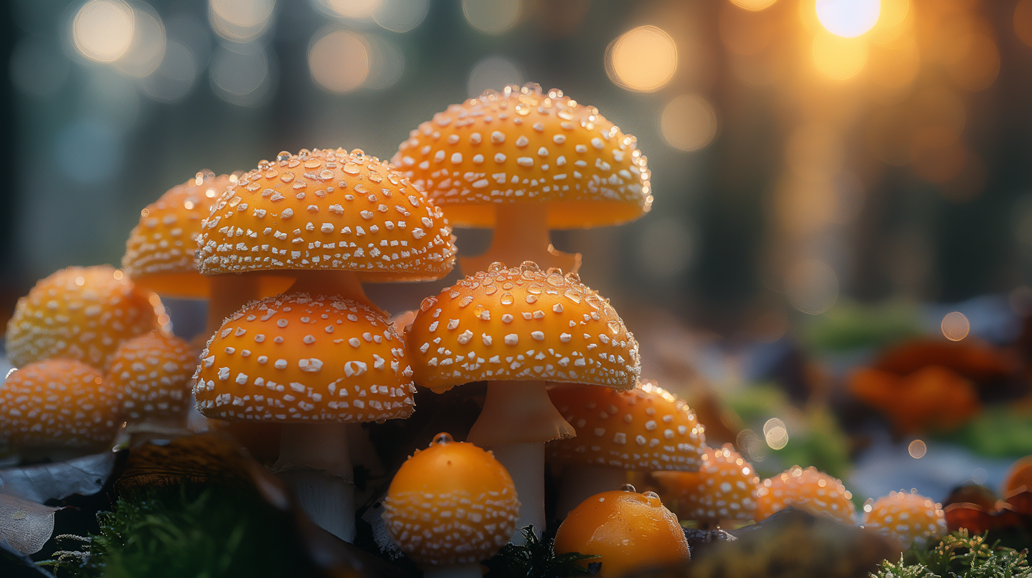 Cluster of orange mushrooms with white speckles and dewdrops, glowing in golden sunlight amidst a dreamy forest setting.