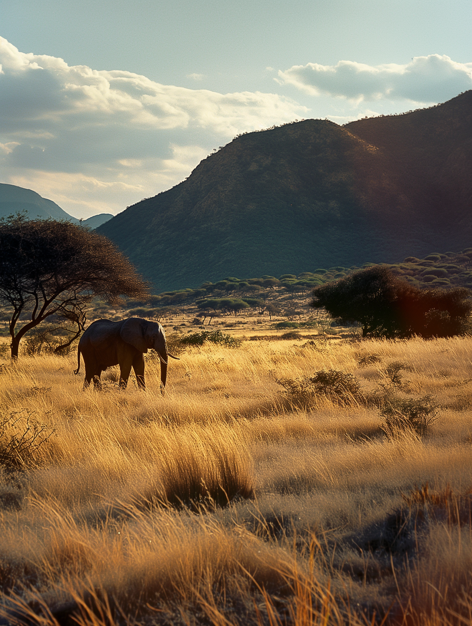 Majestic elephant in a golden savannah with mountains and a tree under a cloudy sky, bathed in warm sunlight.