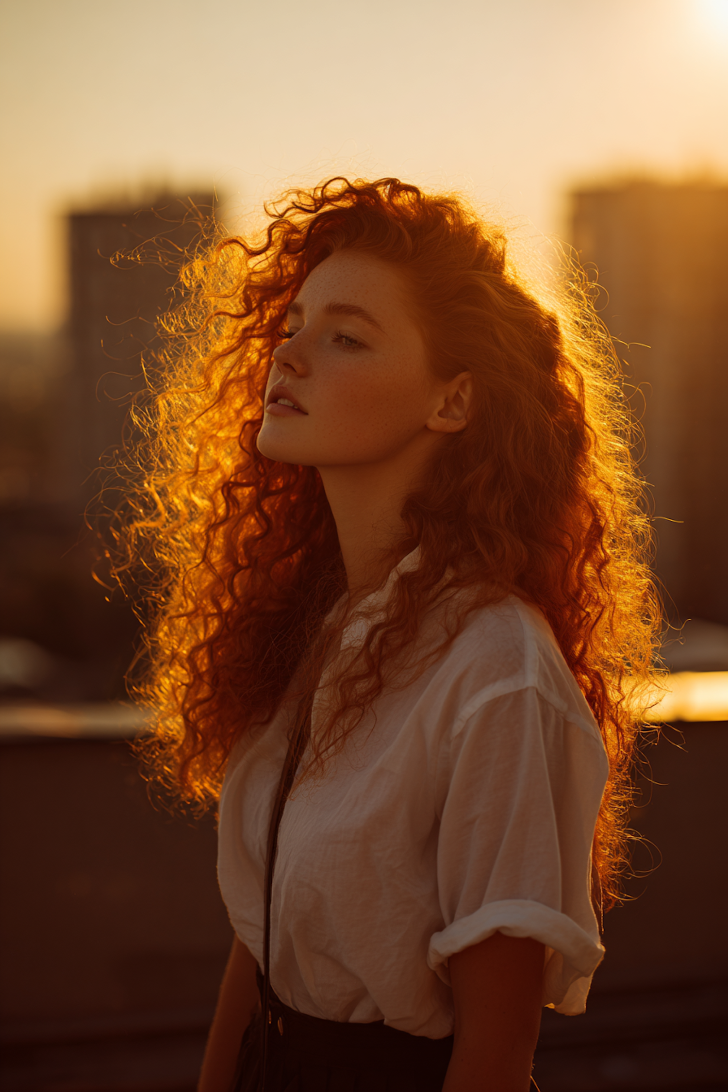A serene portrait of a red-haired woman in golden sunset light, her hair glowing and the urban background softly blurred.