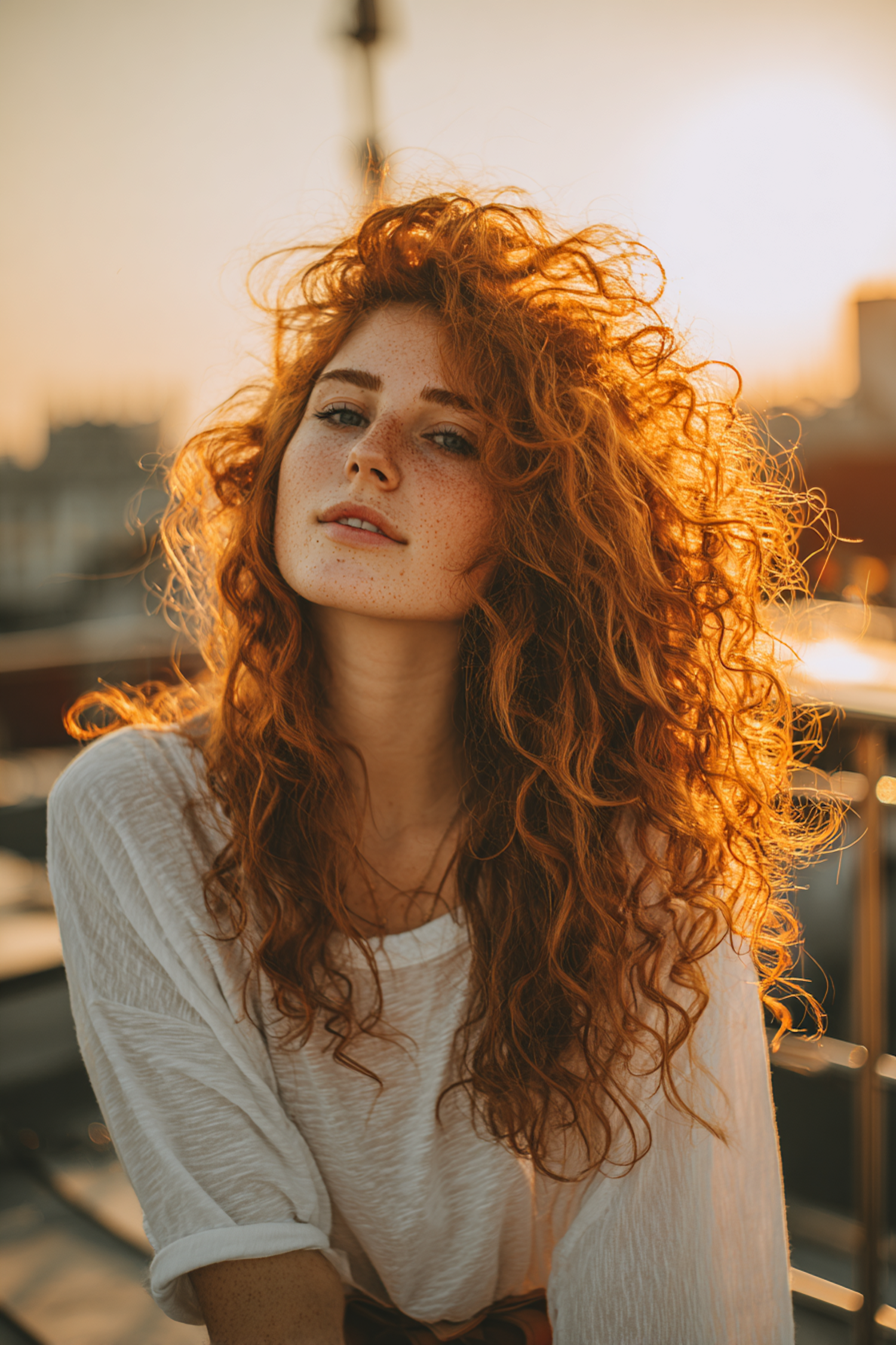 A young woman with red curly hair and freckles, wearing a white top, is illuminated by golden-hour sunlight in an urban outdoor setting.