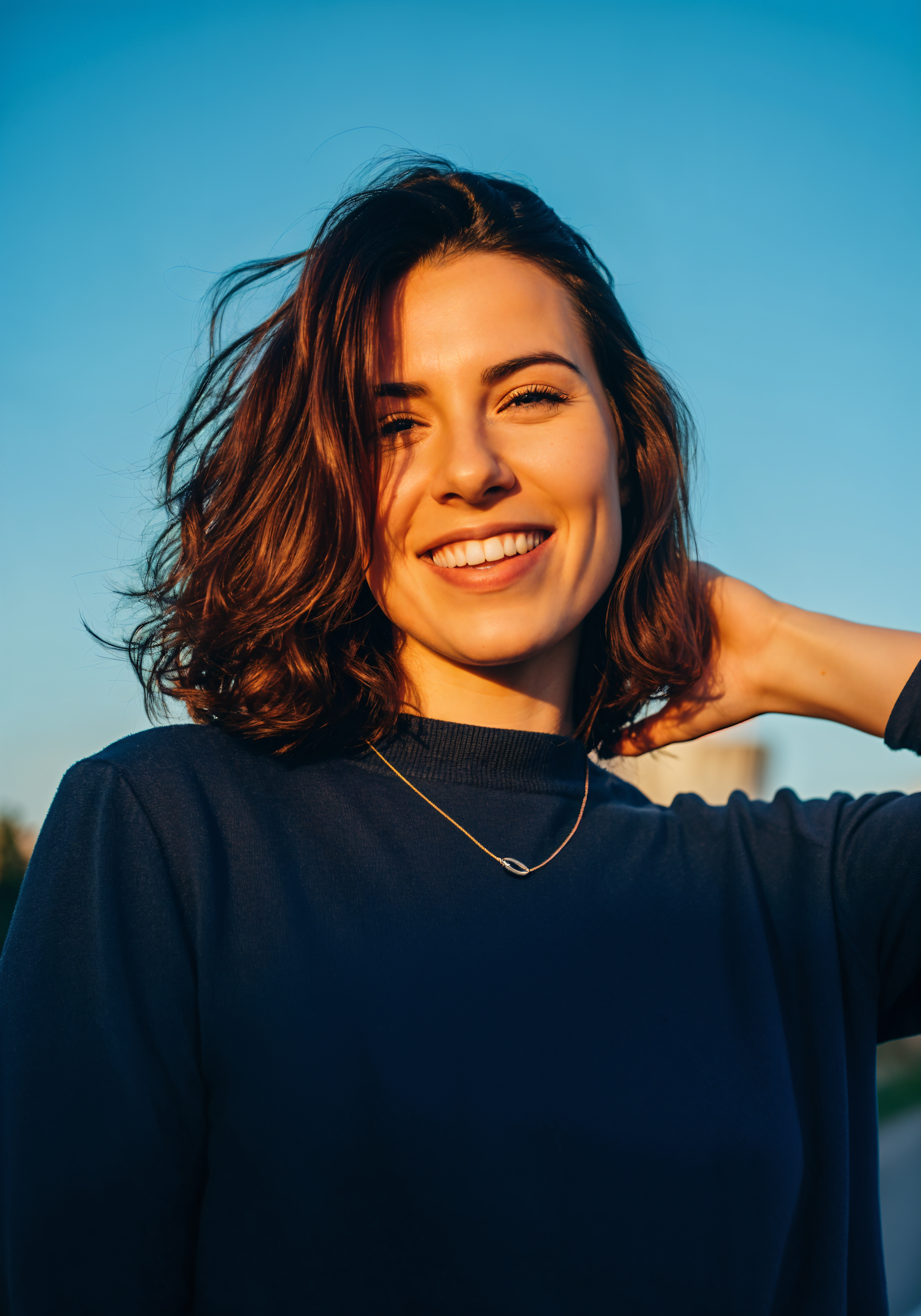 A smiling woman with short brown hair and a navy top enjoys golden hour outdoors, radiating warmth and positivity.