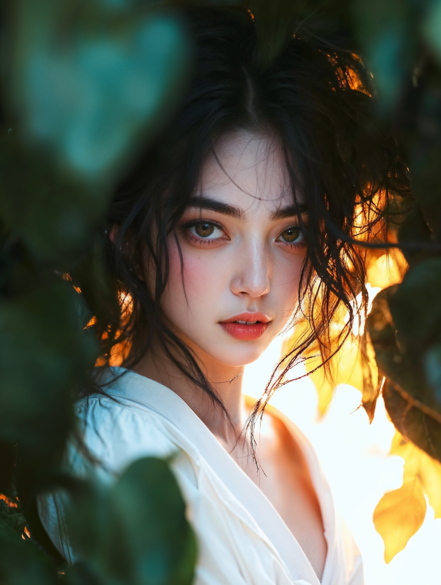 Close-up of a woman with hazel eyes and dark hair, bathed in golden sunlight through green foliage, creating a dreamy, natural vibe.