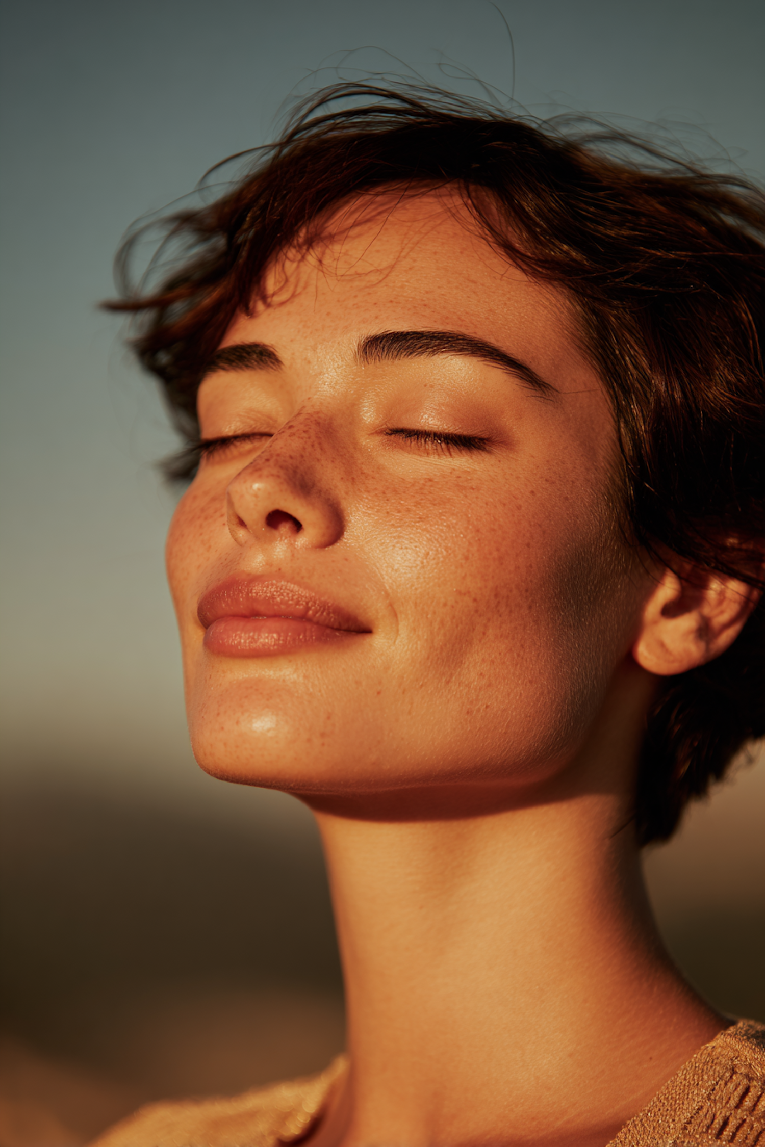 Close-up of a serene individual basking in warm sunlight, with closed eyes and natural freckles, set against a blurred outdoor background.