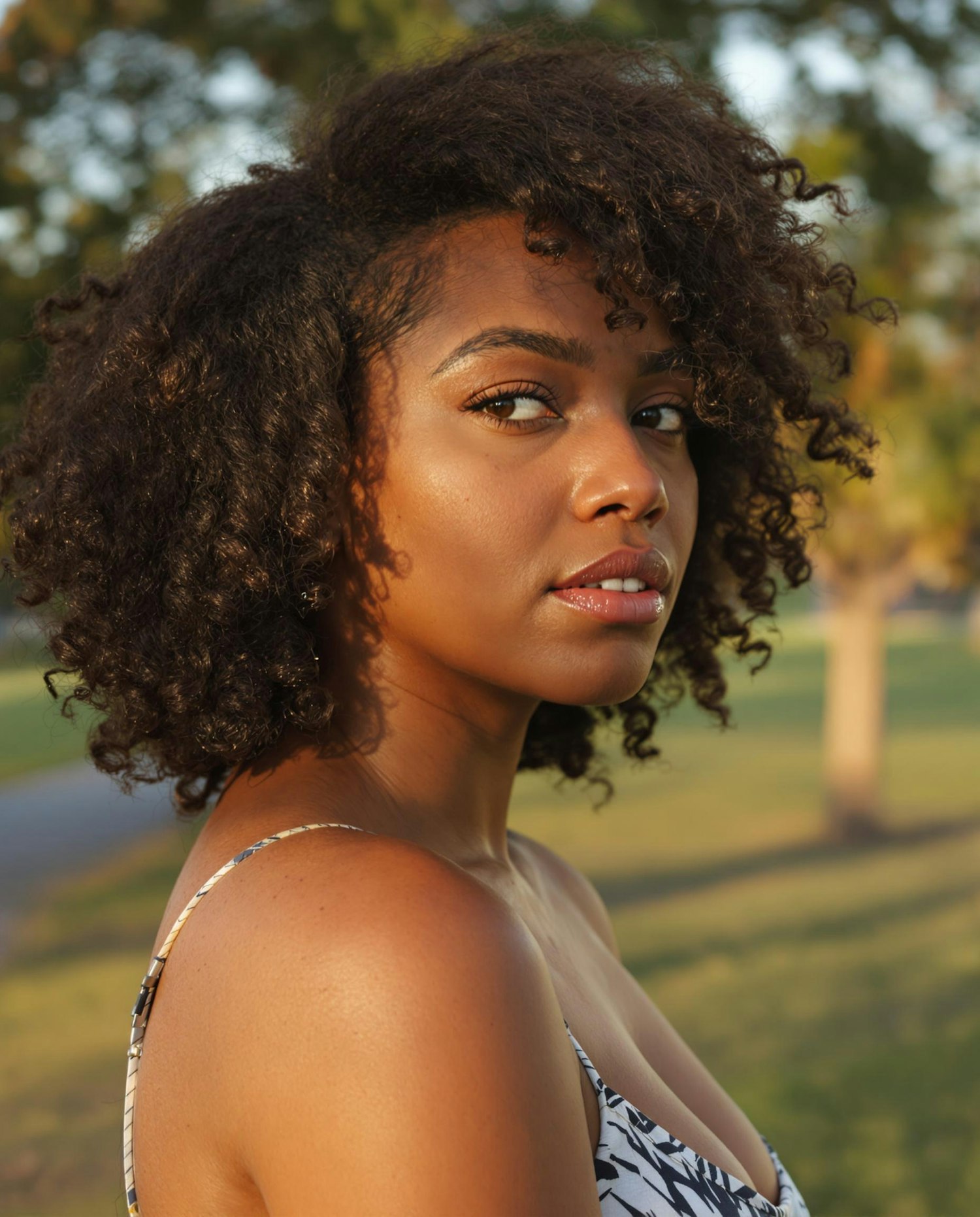 A young woman with natural curly hair and glowing skin poses outdoors during golden hour, surrounded by soft greenery.