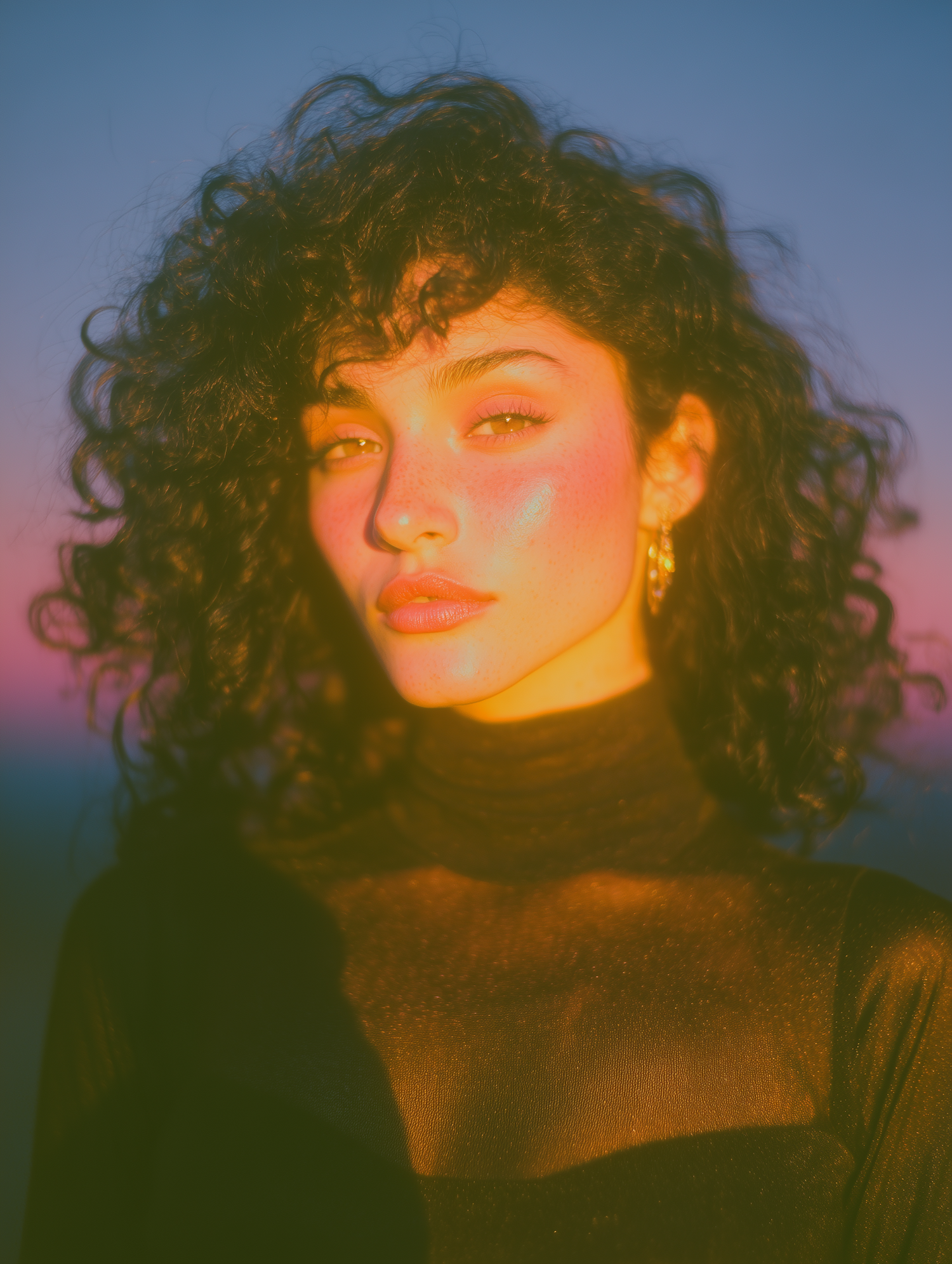 A stunning portrait of a person with curly hair and glowing skin, captured in warm golden-hour light against a pink-to-blue gradient background.