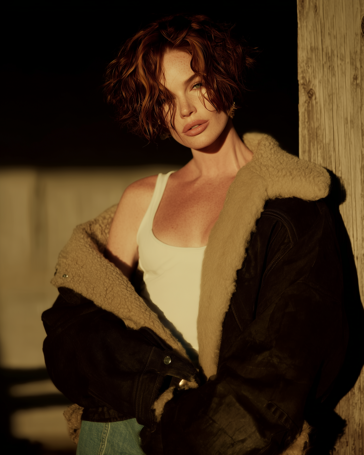 A person with wavy auburn hair in a shearling jacket and white tank top, standing in warm golden light against a wooden post.