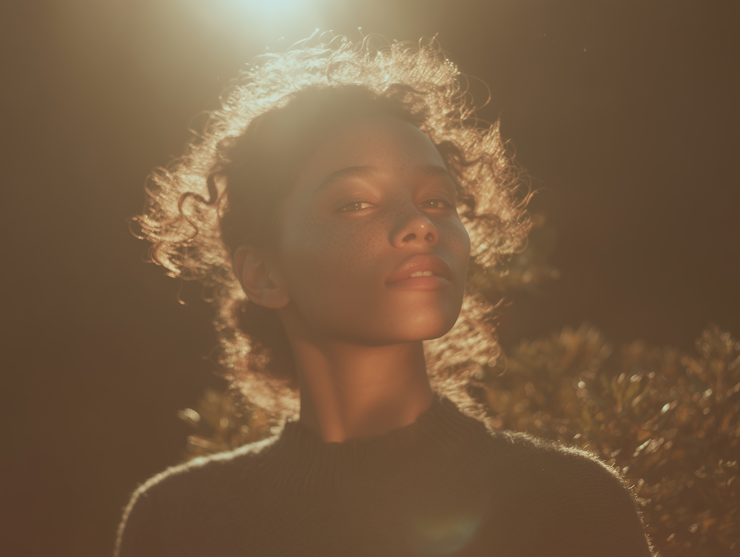 A serene portrait of a young woman with curly hair, bathed in warm sunlight, highlighting her natural freckles and calm expression.