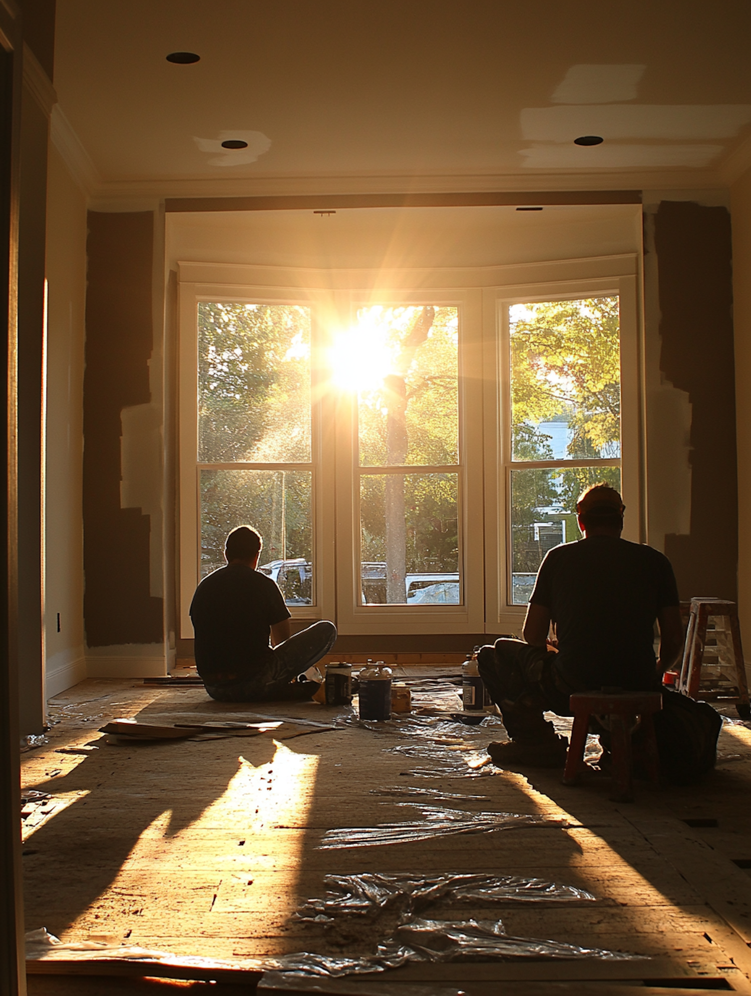 Two workers silhouetted in golden sunlight during home renovation, seated near a large bay window with tools and materials scattered around.