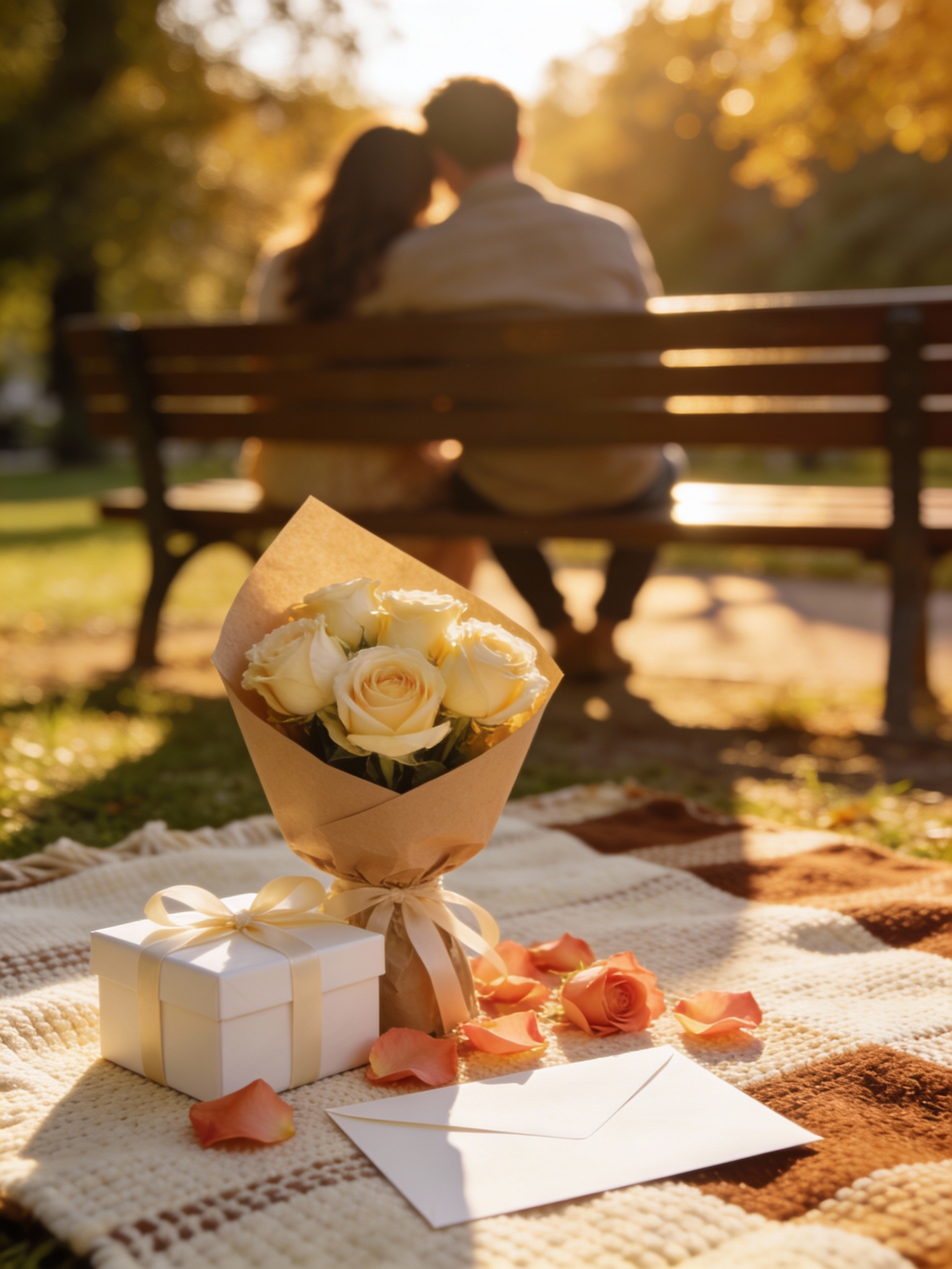 Ultra-realistic cinematic lifestyle photo, vertical 4:5. Golden hour outdoors in a park. Foreground in sharp focus: small bouquet in kraft paper, ribboned gift box, rose petals, and a plain envelope (blank, no readable text) on a picnic blanket. In the background, man and woman sit close together, softly blurred, seen from behind. Warm sun glow, long shadows, creamy bokeh. 35mm look, shallow DOF, premium editorial retouch, subtle film grain. Negative prompt: logos, readable text, watermark, brand labels, staged posing, cheesy props, heart confetti, HDR, oversaturation, plastic-looking skin, over-smoothing, fake skin texture, overly perfect faces, deformed hands, extra fingers, distorted anatomy, unnatural body proportions, exaggerated facial expressions, forced smiles, harsh flash, heavy vignetting, excessive lens flare, motion blur on subjects, unrealistic lighting, over-sharpening halos, noise artifacts, banding.