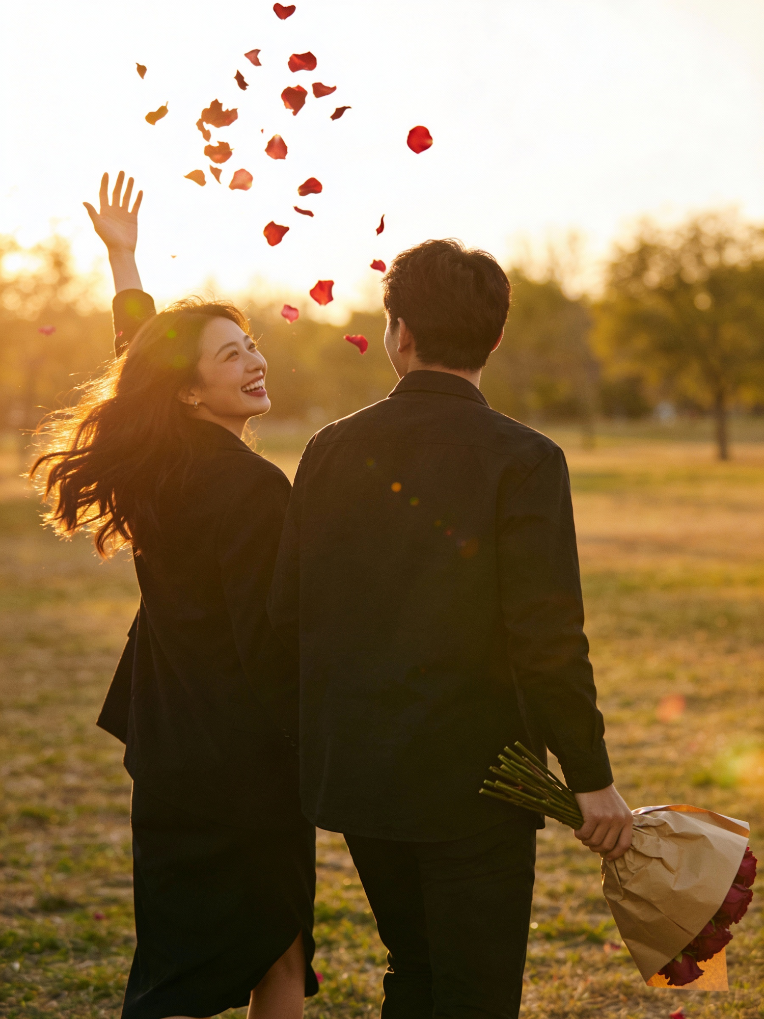 Ultra-realistic cinematic lifestyle photo, vertical 4:5. Golden hour outdoors in an open field or park clearing. Wide back-view shot: man and woman walking away; the woman tosses a few rose petals into the air, both laughing, natural movement. Keep subjects sharp and crisp, petals mid-air catching warm light. Bouquet in kraft paper held casually. Warm glow, long shadows, subtle flare, creamy bokeh. 35mm look, shallow DOF, premium editorial retouch, subtle film grain. Negative prompt: logos, readable text, watermark, brand labels, staged posing, cheesy props, heart confetti, HDR, oversaturation, plastic-looking skin, over-smoothing, fake skin texture, overly perfect faces, deformed hands, extra fingers, distorted anatomy, unnatural body proportions, exaggerated facial expressions, forced smiles, harsh flash, heavy vignetting, excessive lens flare, motion blur on subjects, unrealistic lighting, over-sharpening halos, noise artifacts, banding.
