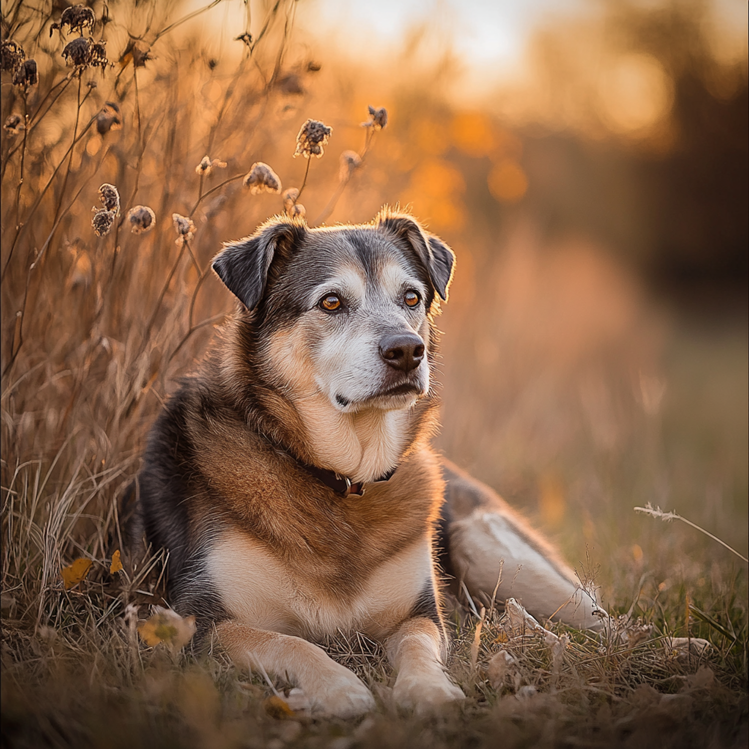 A senior dog with a graying muzzle rests in a golden field at sunset, surrounded by dried wildflowers and warm, glowing light.