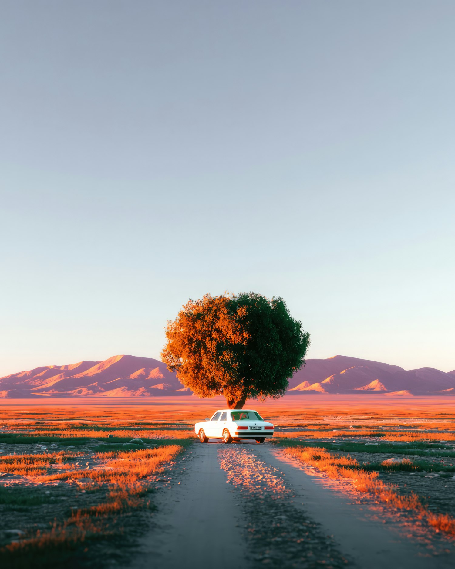 A white car parked under a tree on a dirt road, with a mountain range in the background, bathed in warm sunset light.