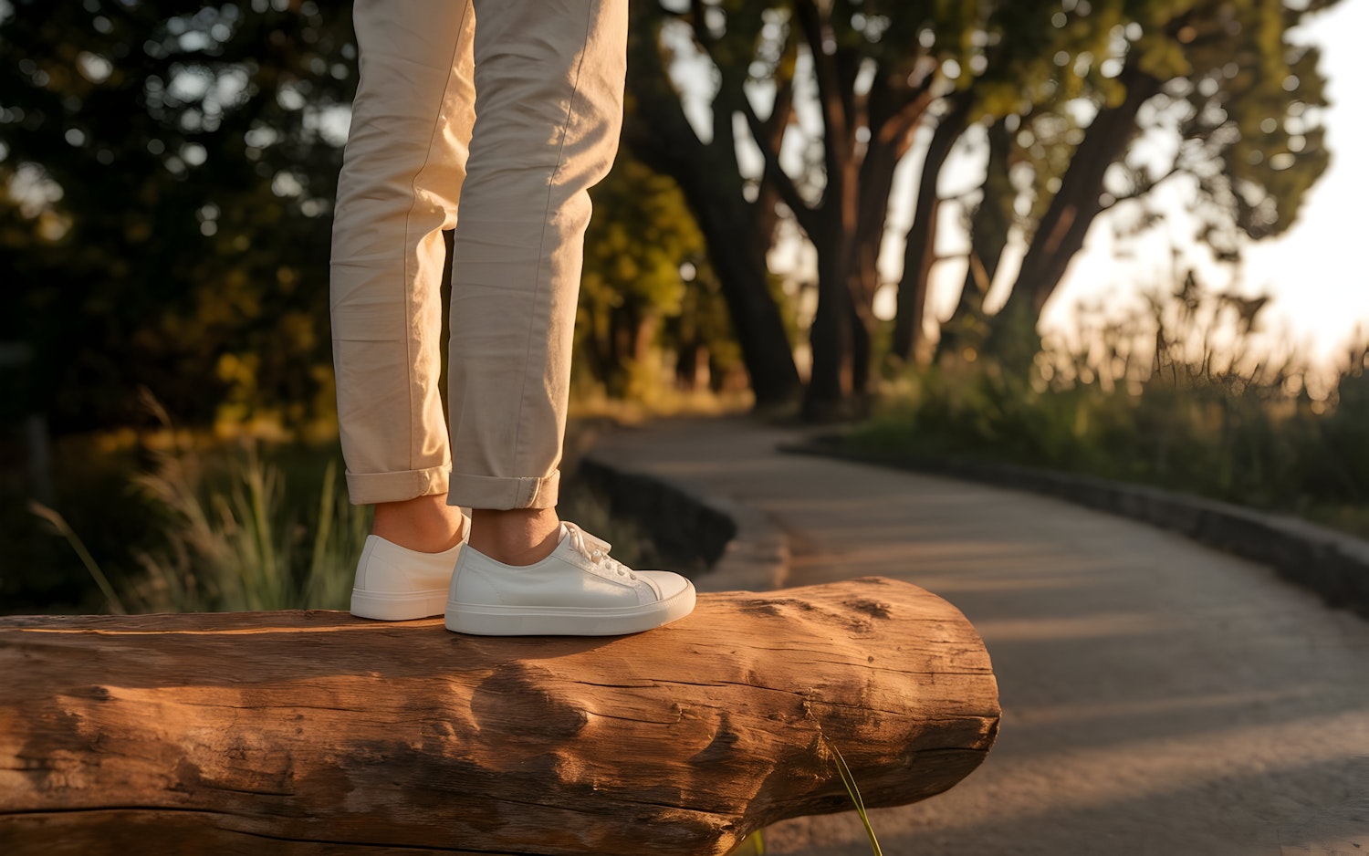 Person in beige pants and white sneakers standing on a log during golden hour in a serene park setting with trees and a paved path.