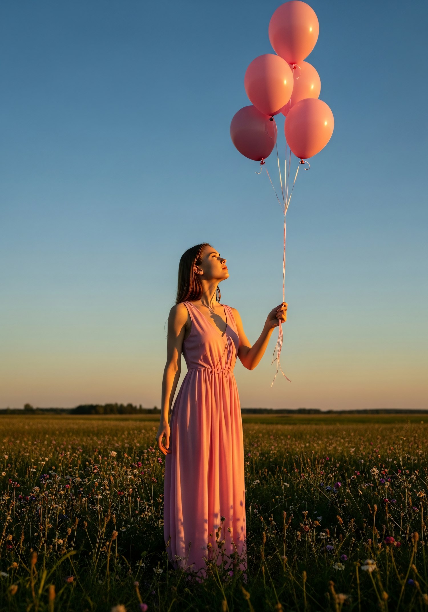 A serene woman in a pink dress holds pink balloons in a wildflower field during golden hour, with a clear blue sky in the background.
