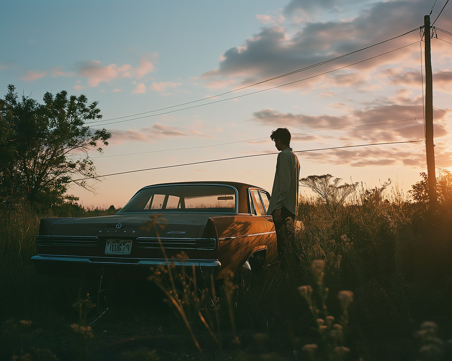 A young man stands by a vintage car in a field at sunset, creating a nostalgic and serene scene with warm, golden hues.
