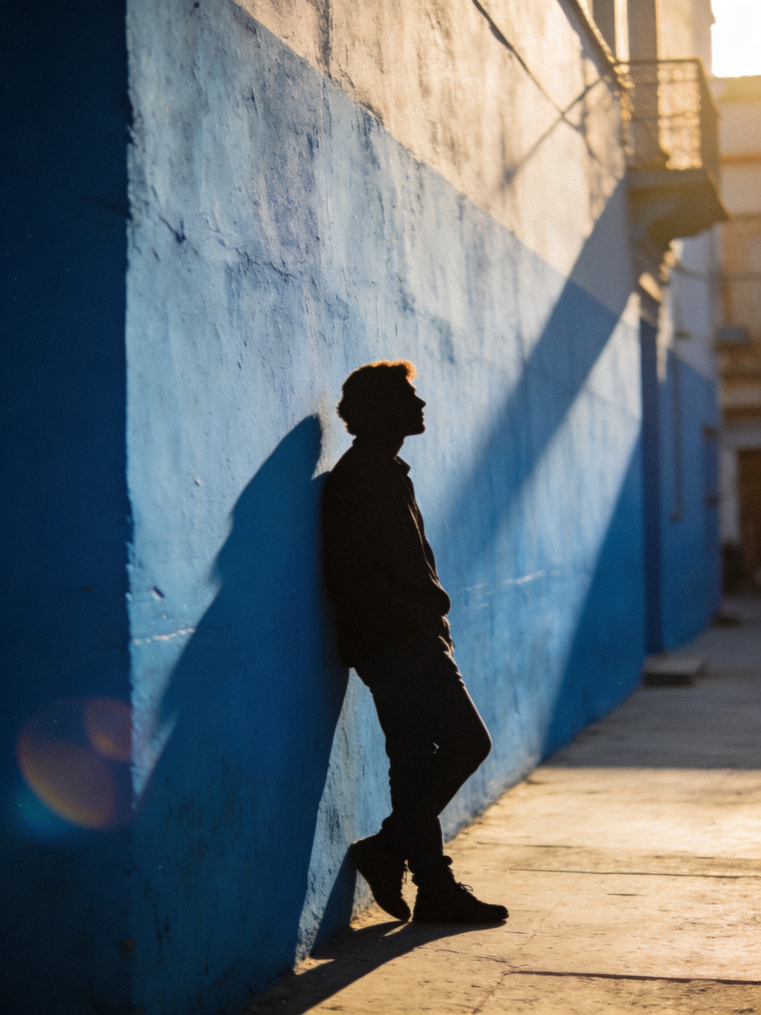 Cinematic street photography, warm late-afternoon sunlight, minimalist urban realism, muted palette with blue painted wall as hero color, gentle film grain, subtle halation, shallow depth of field, 35mm lens look. A person leaning casually against a blue wall, long soft shadows across the surface, calm city mood. No logos, no readable text, no brand names.