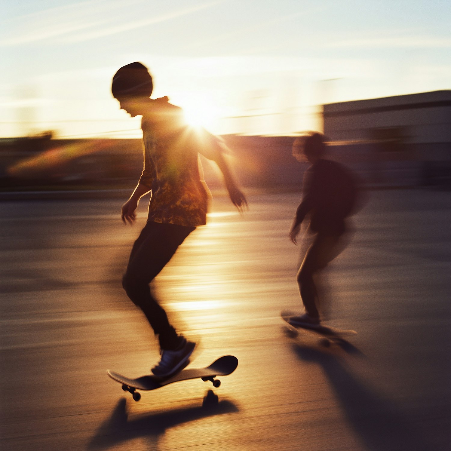 Two skateboarders ride at sunset, silhouetted against golden light, creating a dynamic and nostalgic vibe with blurred motion.