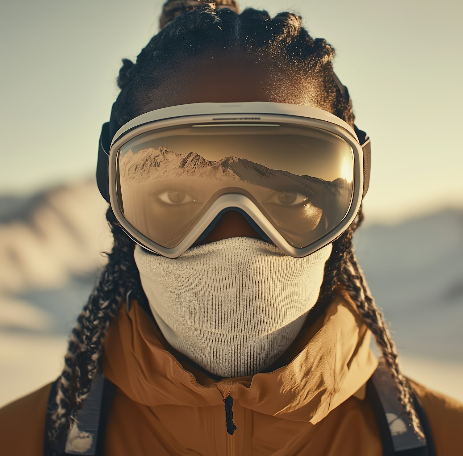 A person in ski gear with reflective goggles showing a mountain view, set against a snowy backdrop during golden hour.