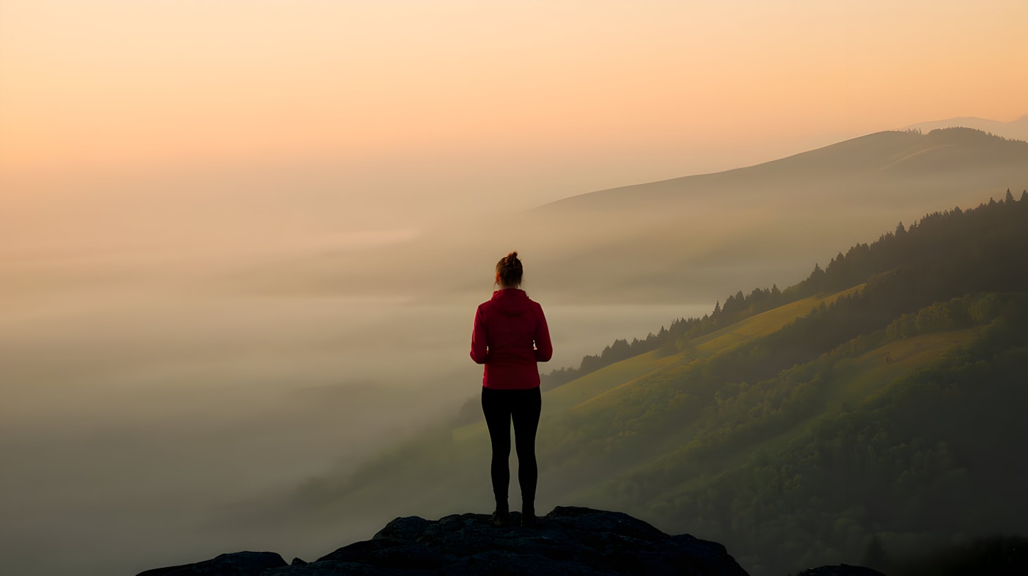 A person in a red jacket stands on a hilltop, overlooking a foggy valley at sunrise or sunset, surrounded by rolling green hills.