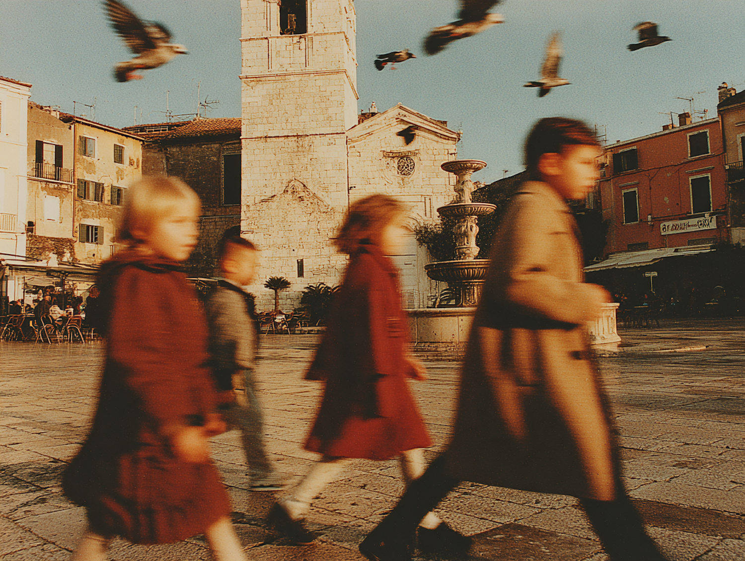 A group of children walking in a historic square during golden hour, with pigeons in flight and a stone clock tower in the background.