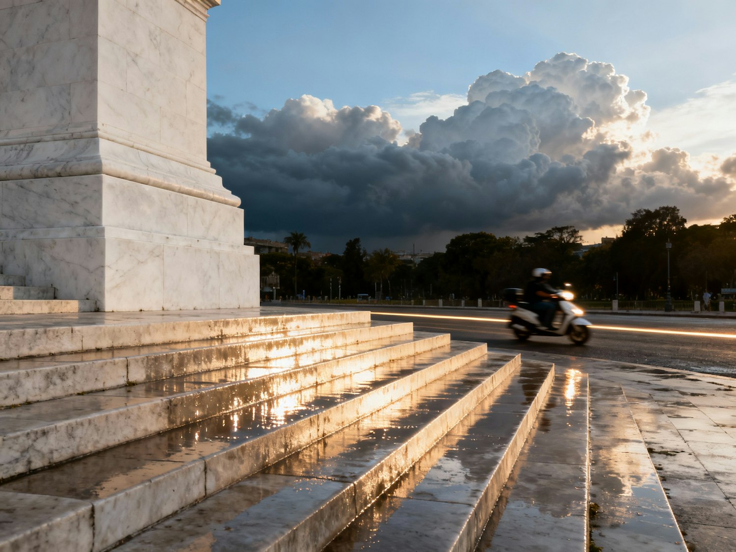 Late-afternoon post-storm; camera-left sun; neutral-warm 5400–5700 K. White monument stays neutral; marble steps damp with soft speculars; scooters streak through sun stripe; dramatic cumulus receding. Settings & CPL same. Negative: blown whites, halo edges, over-clarity, HDR look.