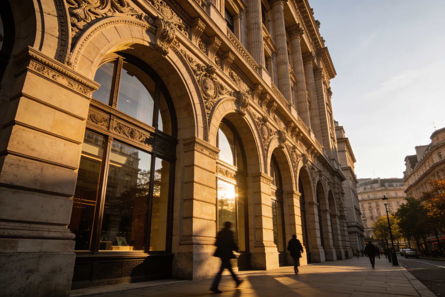 Exterior of a grand European commercial building, ornate stone facade with tall arched windows, warm late-afternoon sunlight, slight upward angle, financial district setting, architectural photography