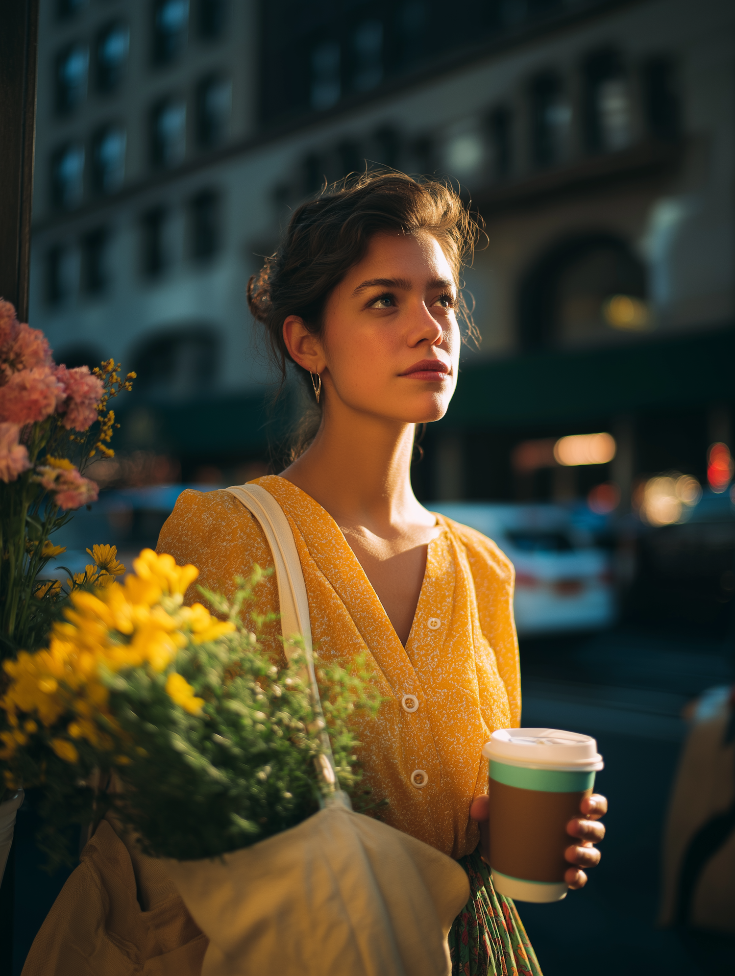 A young woman in a yellow blouse holds flowers and coffee, standing in warm sunlight with a cityscape in the background.