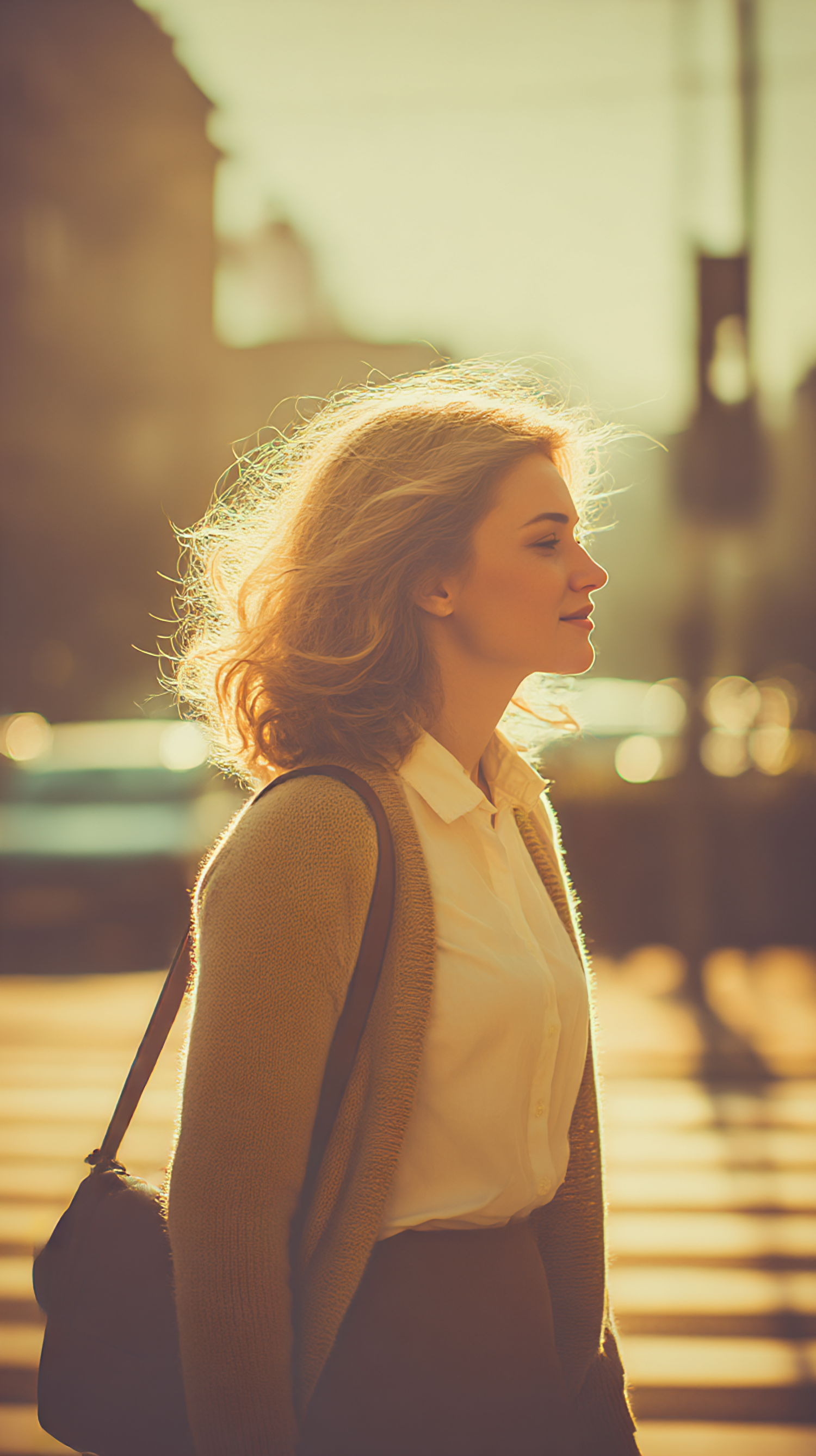 A woman with blonde hair walks in warm sunlight, wearing a white blouse and beige cardigan, with a blurred urban background.