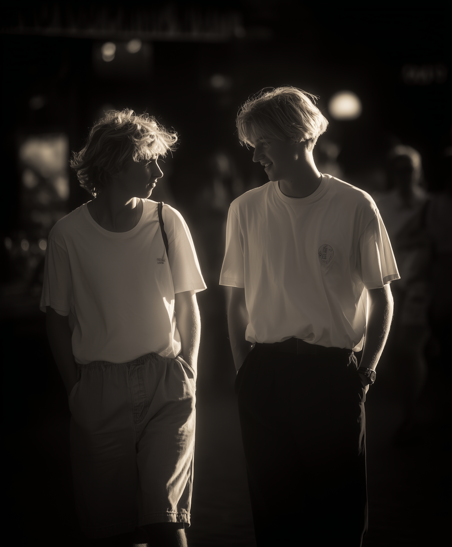 Two people walking together in warm lighting, wearing casual outfits, and sharing a moment of conversation.