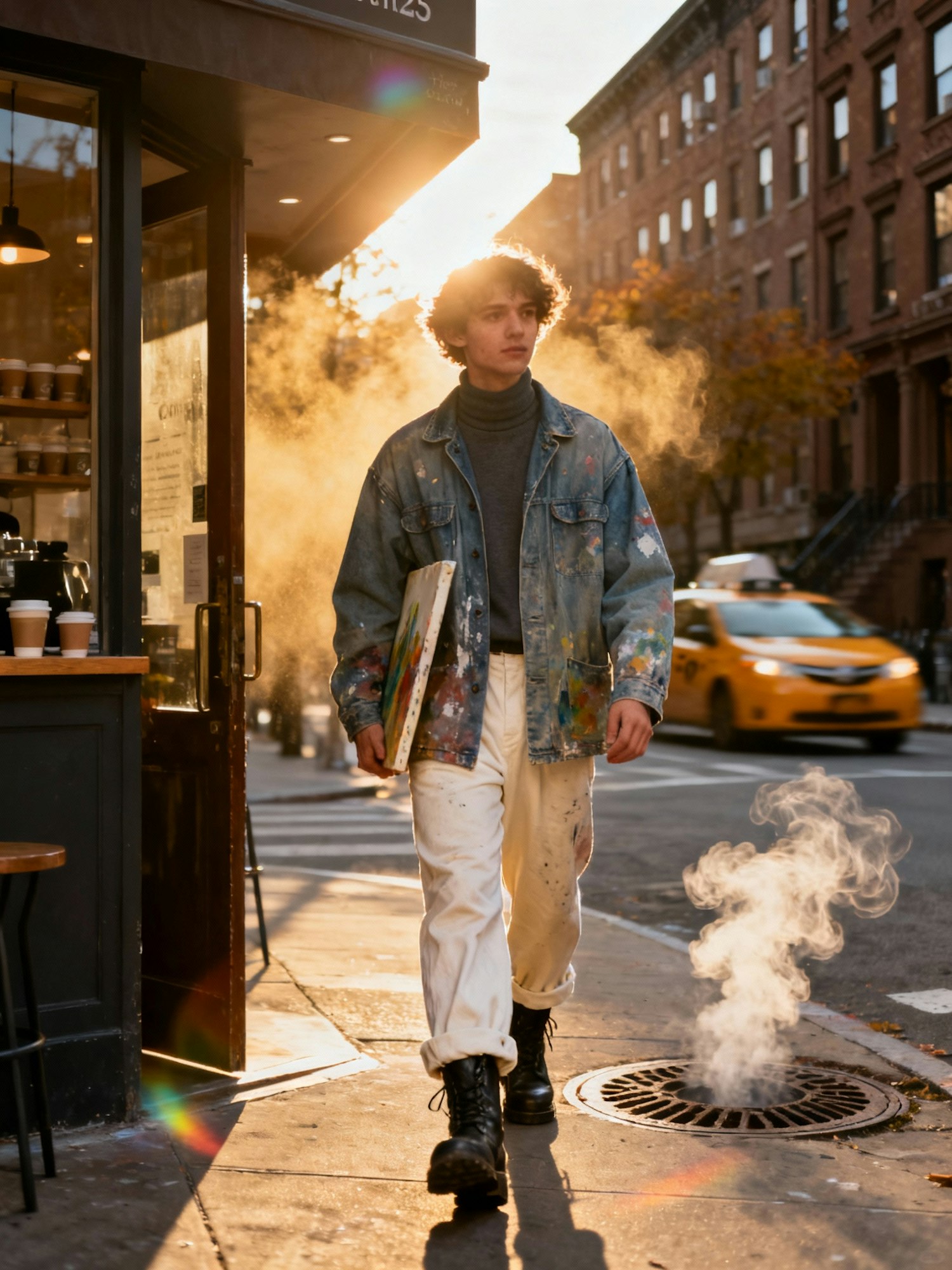 A realistic street-photography fashion image captured 'across the street' in New York City, early autumn 2025, late afternoon. The low sun glows between brownstones in the East Village, scattering golden dust through the air as a young painter emerges from a corner coffee shop, canvas tucked beneath his arm. He wears a faded denim chore jacket splattered with paint, a charcoal turtleneck, and loose cream trousers cuffed above heavy black boots — the quiet confidence of someone who builds worlds in secret. His expression carries both fatigue and triumph, that flicker artists wear after finishing something that might matter. Steam rises from a nearby manhole, curling through his silhouette as yellow cabs blur past behind him. Captured on a Sony A7R V with a Zeiss 55 mm f/1.8 lens at f/2, 1/640 s, 14-bit dynamic range, 75 MP equivalent, subtle halation around highlights, soft edge falloff, gentle Portra-style grain, and a faint lens flare kissing the pavement.
