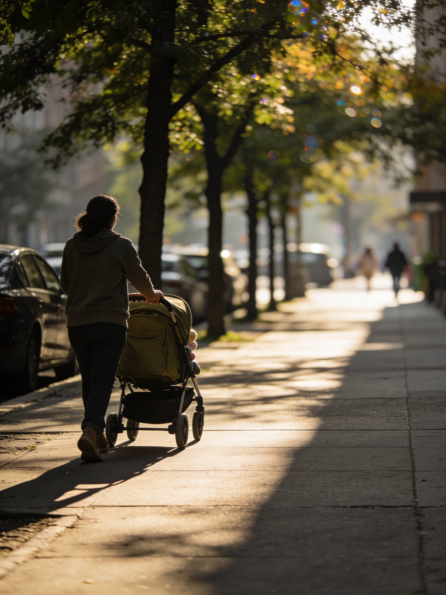 A person walks along a sunlit sidewalk, pushing a green stroller under tree shadows, creating a serene urban scene during golden hour.