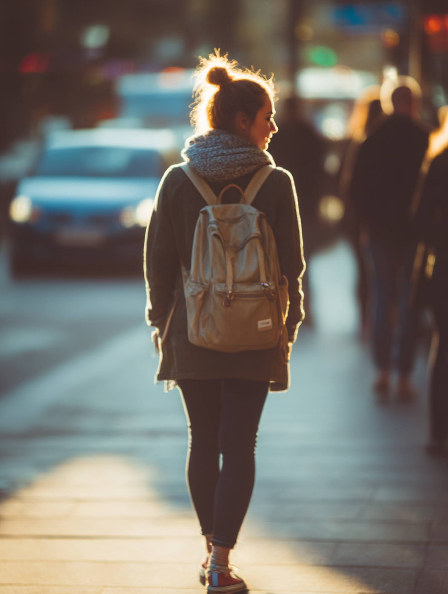 A young woman with a backpack walks in a city during golden hour, surrounded by blurred pedestrians and vehicles, creating a serene scene.