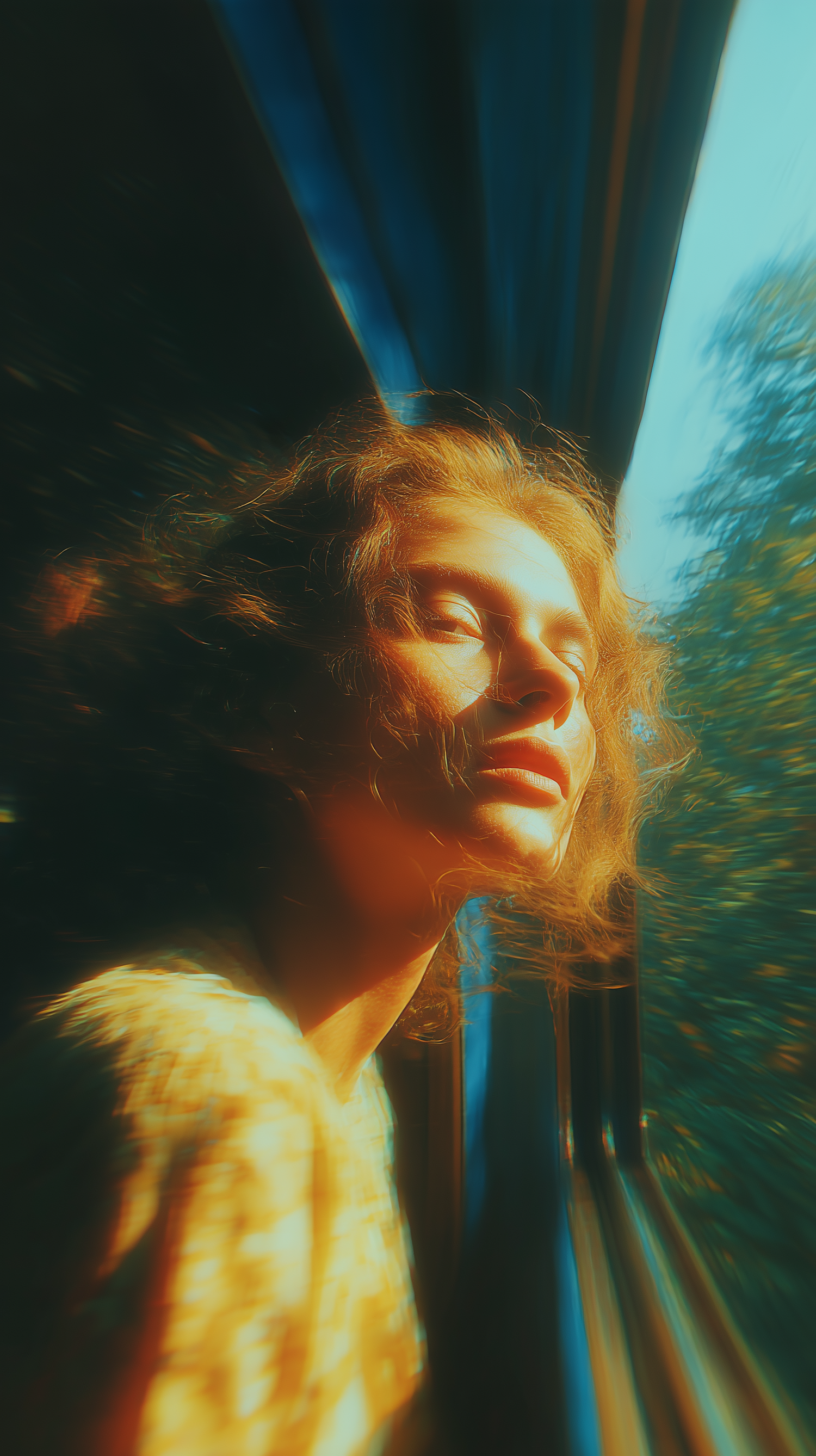 A serene moment captured as a person leans out of a train window, basking in golden sunlight with a blurred, vibrant background.
